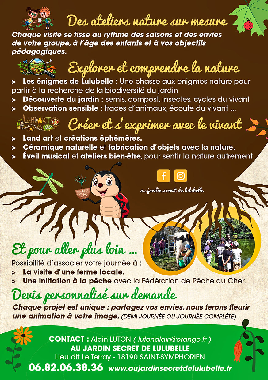 Nous vous proposons d’organiser une sortie scolaire au Jardin Secret de Lulubelle, de fin avril à début juillet.